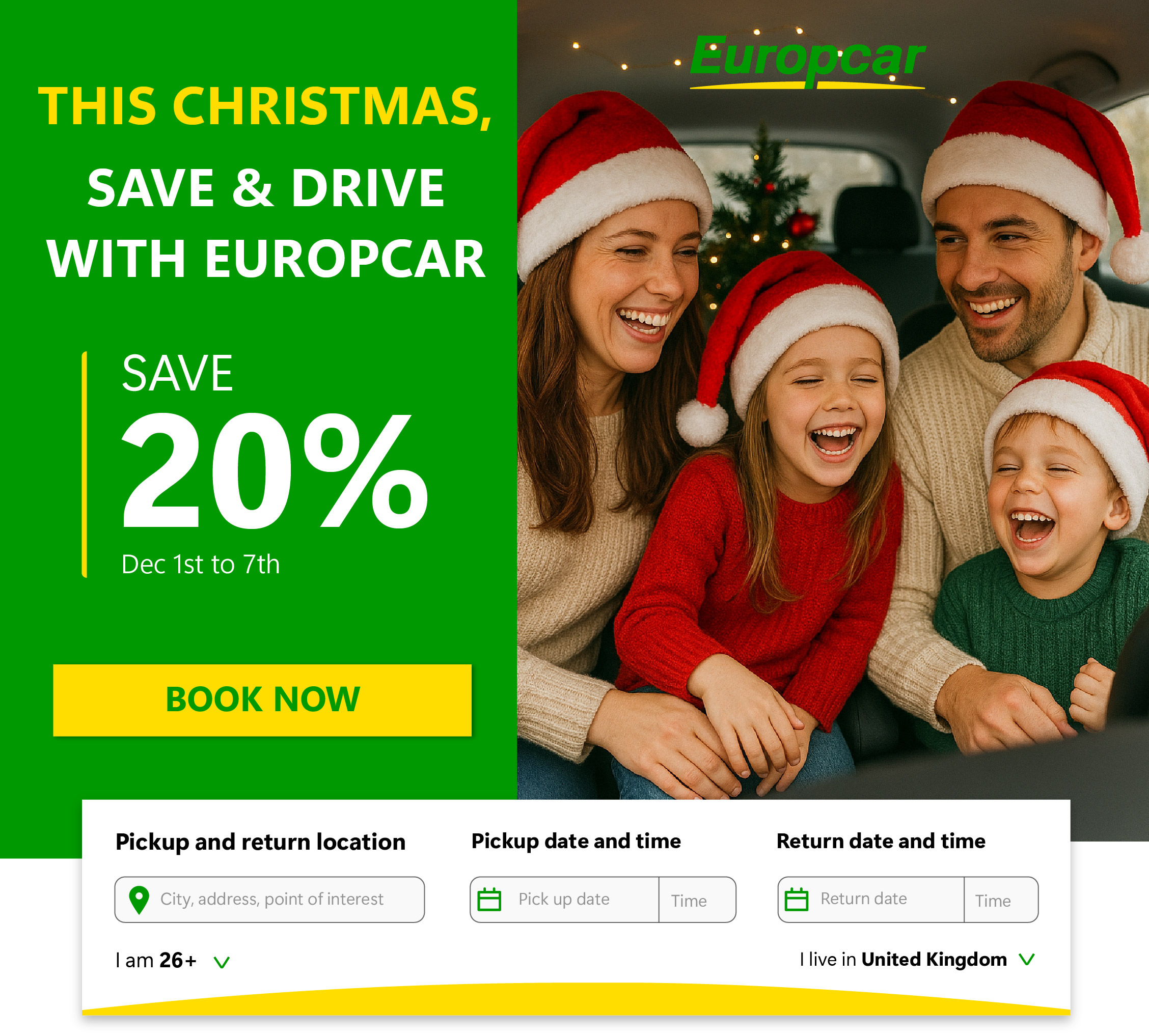 La campagne Europcar propose une remise de -20%. « Save & Drive » fait manifestement partie d’une stratégie de conversion plutôt que d’une simple communication de vœux. - L’analyse de la création